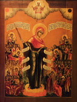 Поэтому и изображается Богоматерь на иконе во весь рост, в окружении разного рода бедствующих людей - нагих, обиженных, алчущих. Около этих бедствующих изображают часто Ангелов, посланных Владычицей для утоления страдания людского; Ангелы, приникая к людям, указывают им на Богоматерь.